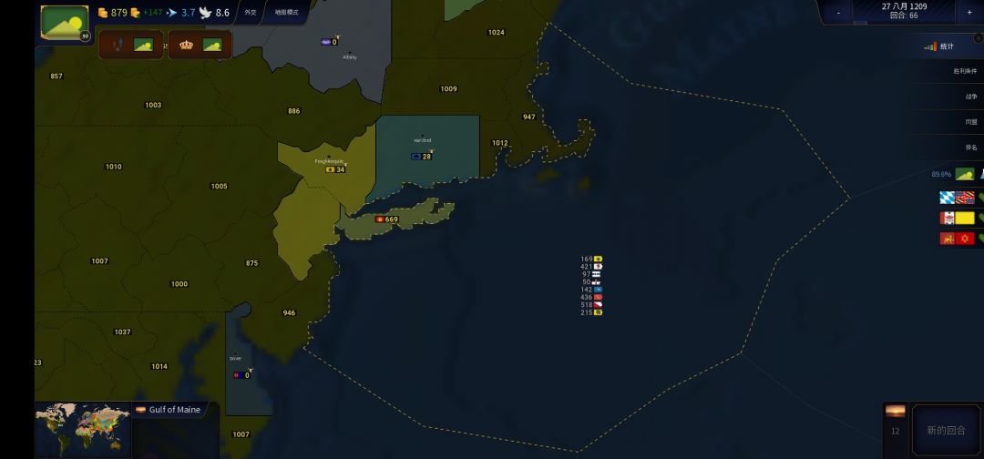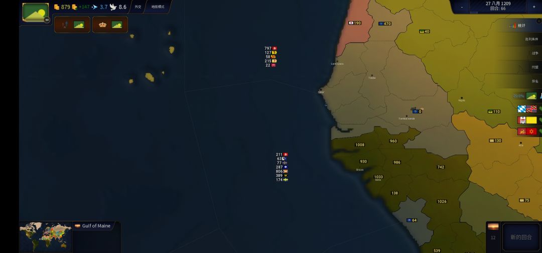 再次把视线放在各国,前100回合基本没有战争(玛雅的战争除外),但到了后100回合,战争开始多了起来。虽然我把外交指数调的70%(正常125%),大大减少了各国之间的外交活动,但是战争还是挺多的。。。想一想把外交指数开到最大(400%)国家之间会怎样!想都不敢想。(外交指数开到最大的话就和开了战争狂热没啥区别了。。)