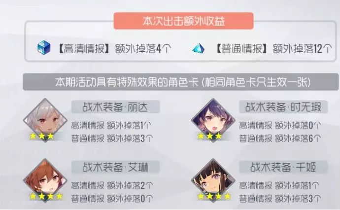 P:活动掉落加成的角色放在支援槽里也是有效的,请注意这一点。(如:战术装备·丽达)