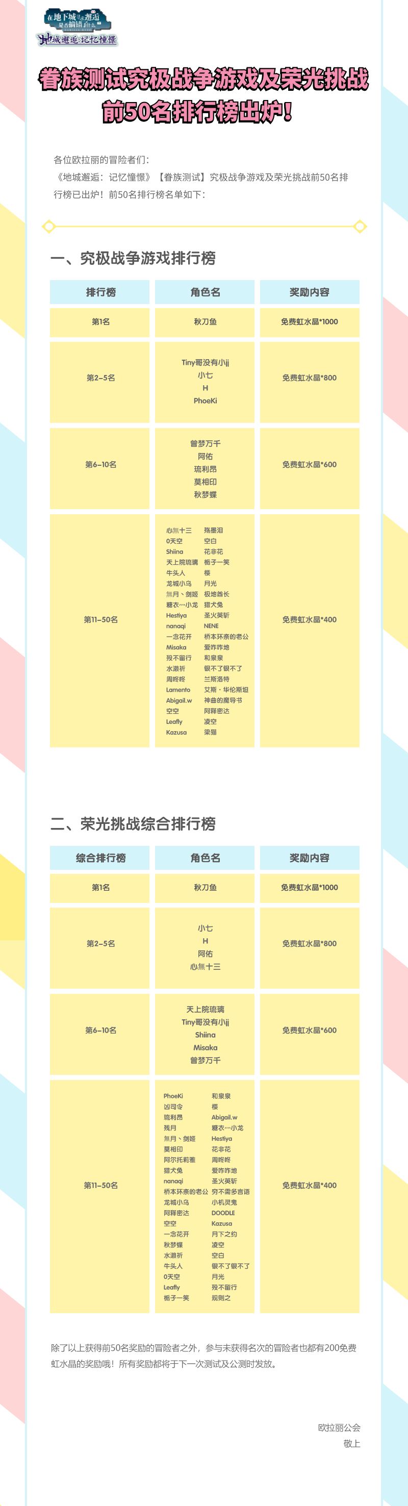 现在就由本喵阿妮雅,为大家正式宣布,获得第一届欧拉丽究极战争游戏及荣光挑战的前50名的冒险者!