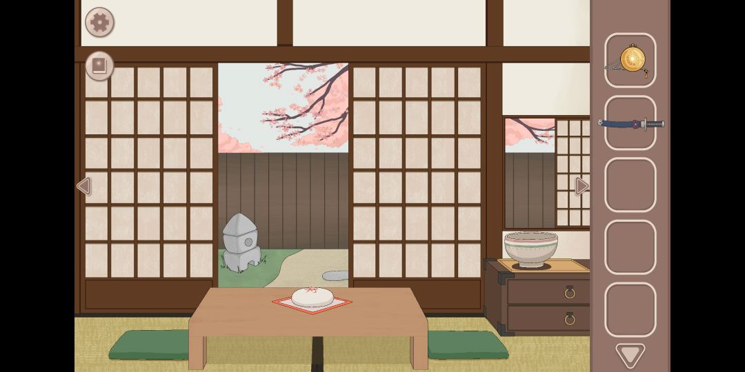 寿饼在包袱里 拿到后放到桌子上 用武士刀切开 拿到树枝