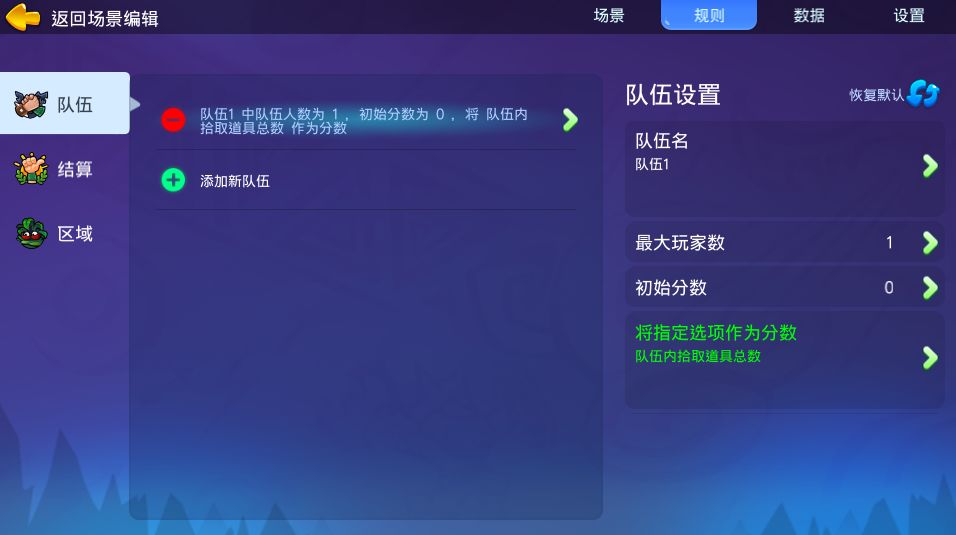 每个地图可设置1~5个队伍(至少要有1个队伍哦),可编辑队伍名称、人数、初始分数、选择分数定义。