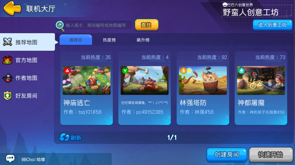 进入页面后,在“推荐地图”里可以选择推荐区或者榜单上的优秀地图,创建房间游戏畅玩,也可以直接在“作者地图”选择已有房间快速加入。遇到喜欢的地图记得收藏或者记住地图编号,下次就能找到啦!
