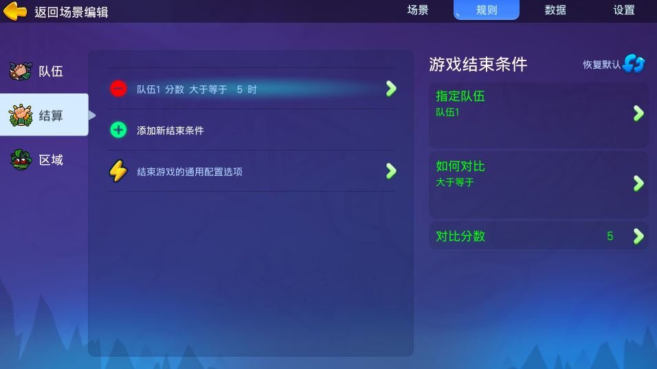 在结算的通用配置中,可以设置游戏时长(1-10分钟)、排名规则,此外还可添加新的结束条件。