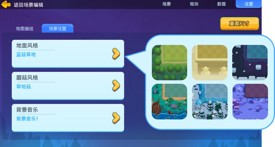 创意工坊目前提供了7张不同风格的地表,一年四季白天夜晚,可配合地图的主题任意选择。还可以选择自己喜欢的蘑菇风格和背景音乐。