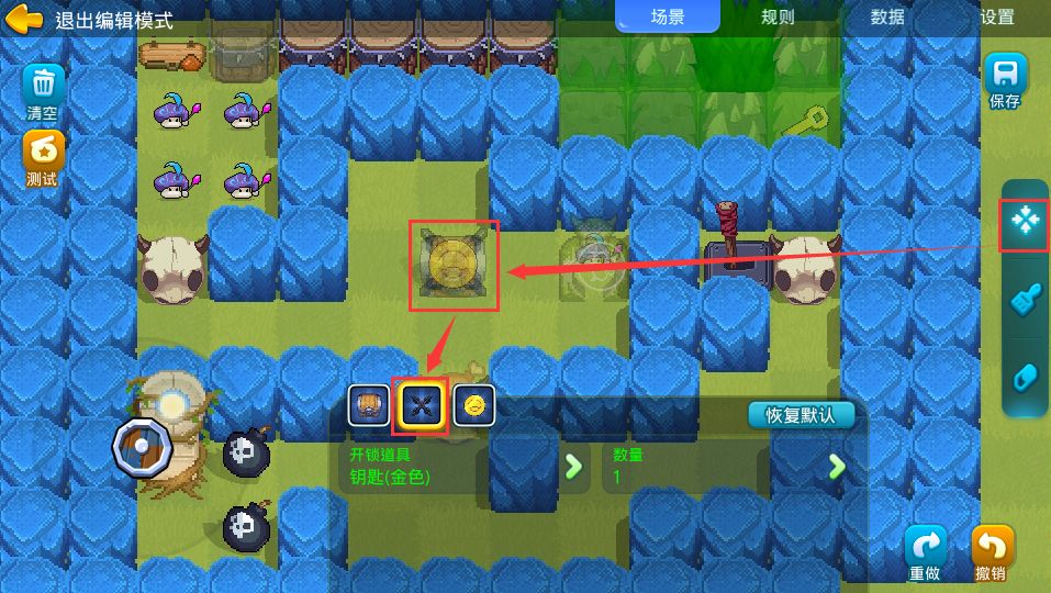 部分道具可以设置特有属性,以协助实现更多功能。例如:一个上了锁的宝箱,可以选择锁,设置属性为1把金钥匙解锁。