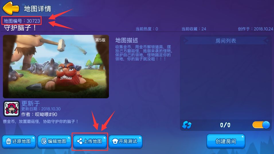 上传后的地图,就可以被其他玩家搜索到了,记得告诉你的好友们地图编号(左上角数字,见下图↓)。你的地图被越多玩家下载和收藏,会积累越多的热度点数,就有可能出现在飙升榜和热度榜上,被更多玩家看到啦!