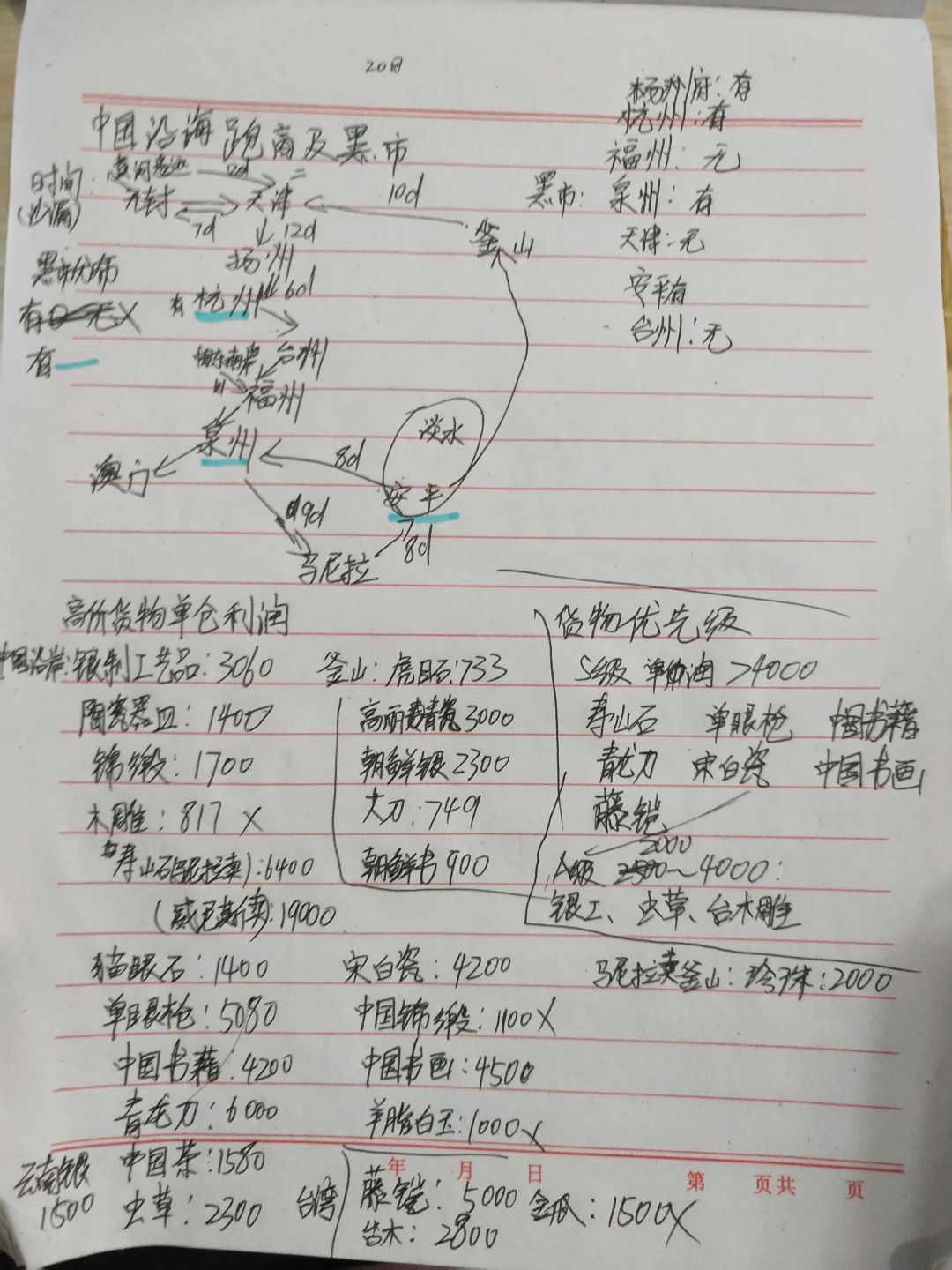 最开始研究这个东西是因为看群里攻略的东亚跑商路线,在货物选择方面众说纷纭,也不知道到底怎么赚钱快,我就自己把东亚跑商的常规货物进行了一下统计,一算才知道以前的跑商路线有很大问题,下面是东亚单仓利润图,字难看请别吐槽,