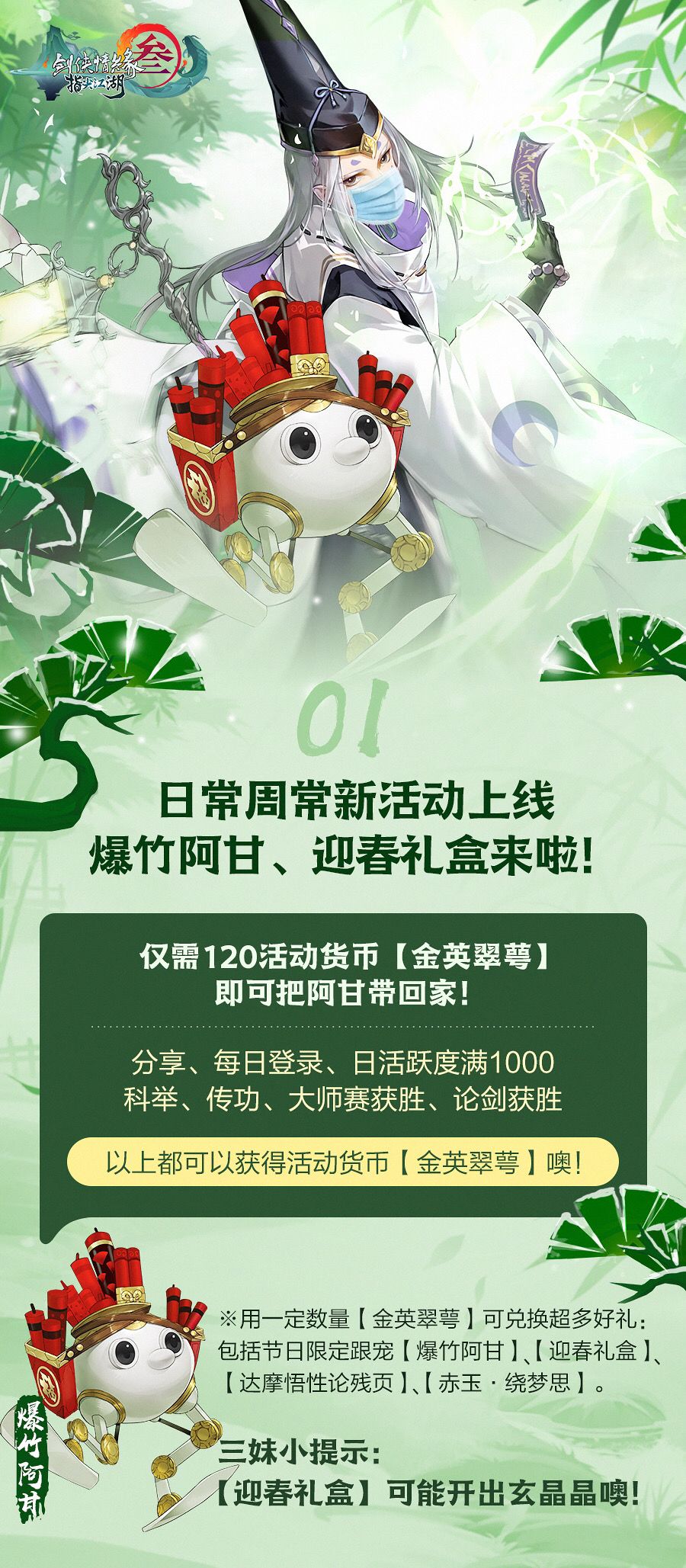 一起来迎春啦!这次不仅有超萌的【爆竹阿甘】等你带回家,使用全新活动货币“金英翠萼”兑换的【迎春礼盒】还有可能开出玄晶噢!详情记得戳图↓↓↓~
