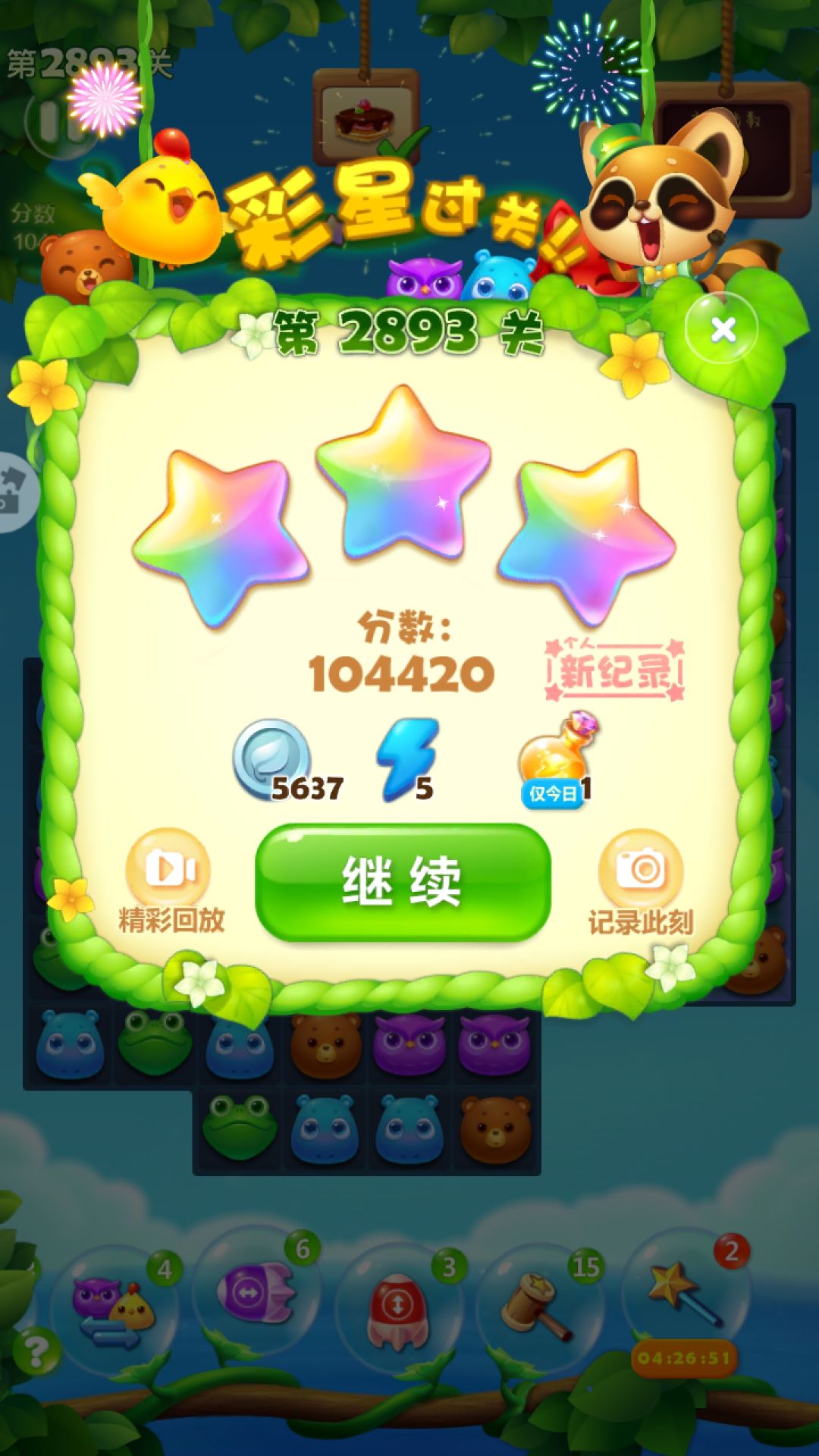 2893,公认彩星难关,步数不足,这把右侧消除银币时爆分′了,不然也过不去,不过因为爆分,省了个加五步。