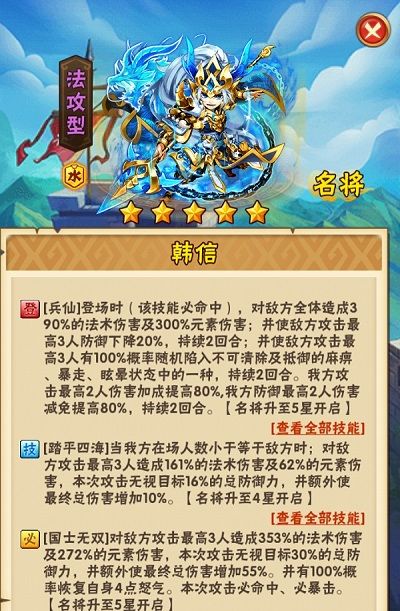 2.韩信登场技能为「对敌将造成伤害,使敌方攻击最高3人防御下降,随机陷入控制状态,我方攻击最高2人伤害加成增加,防御最高2人伤害减免增加。」简直就是刘邦的加伤版,不过韩信多了控制状态,这些状态能为韩信创造良好的输出环境。
