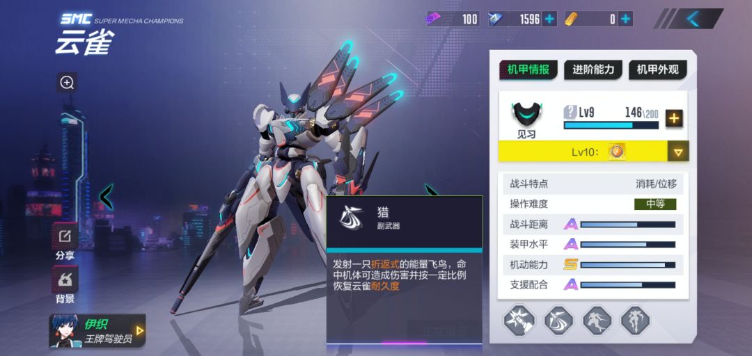 首先是云雀的面板,机动性在目前的机甲之中算是优良的一个,武器是一把能量步/枪,载弹量为24,射速中等小声bb:说实话第一次看见云雀的武器我还以为是把击剑