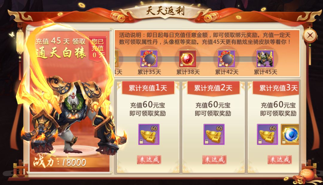 开服15天后,等级达到125级的上仙可参与天天返利活动赢取丰厚奖励。每日充值6元,即可领取60绑元返利,累积充值天数还可免费领取天神属性丹、专属头像框、酷炫坐骑化形等专享奖励!