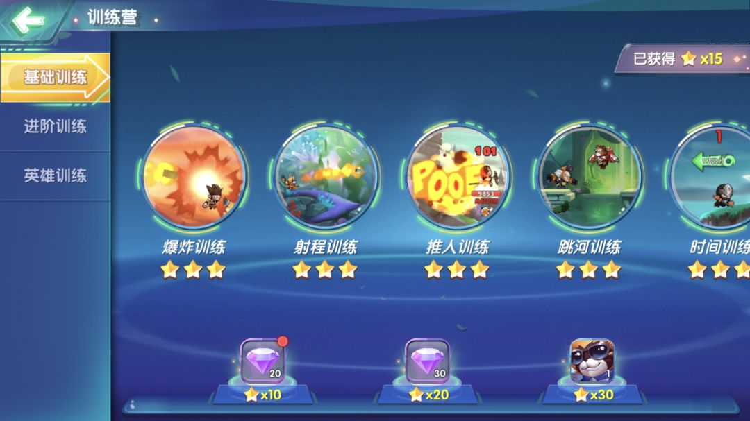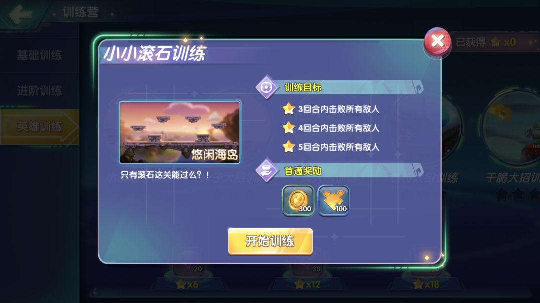 2,训练营:我们将怦怦英雄中的大量技巧和关键点,包括英雄的特性和英雄之间的配合组成了我们的全新训练营,每场训练营均有三种奖励难度,一星通过,两星通过,三星通过,星数越高获得的奖励也越好,全部三星通过可不是一般人能做到的哦~