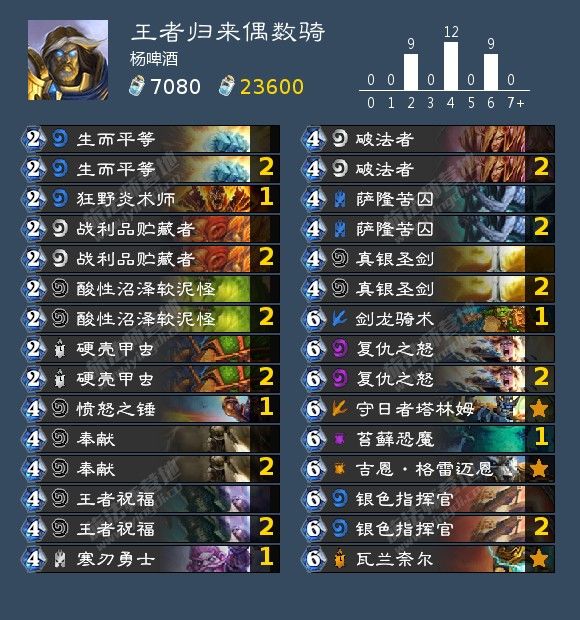 整体的留牌思路是打快攻留二费随从,找真银圣剑和奉献,打慢速找王者祝福和瓦兰奈尔,二费随从只留一个。