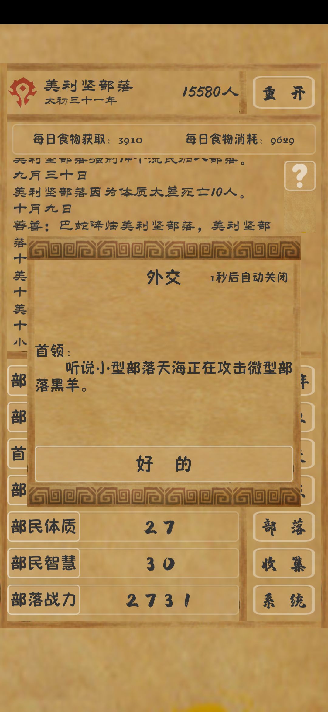 不管怎么点击都无效,自动退出也加载不出,关游后重启还是会出现这个事件然后卡住,难道要我灭掉这两个部落吗