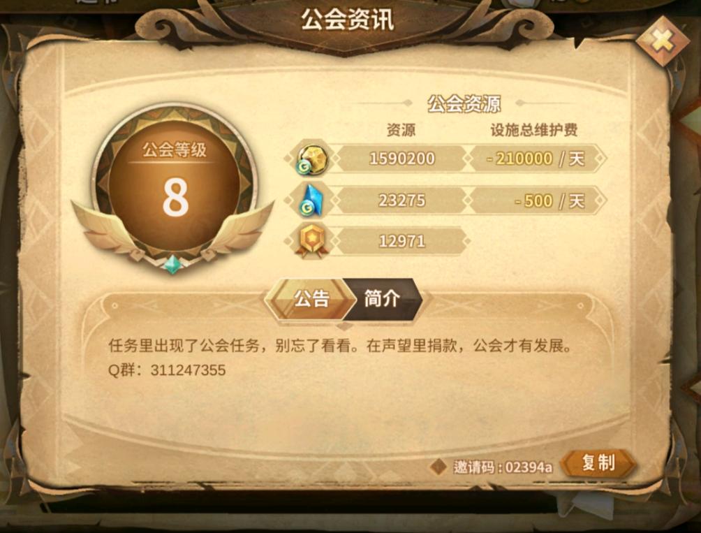 我们公会秉持游戏的初衷,以休闲为主,公会轻松愉悦,不需要费时费力。只需要把公会任务做了就行。设施全开,以人为本 公会QQ群 311247355 邀请码 02394a
