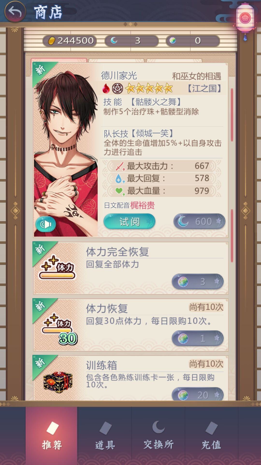 商店中道具选项,是主要消耗月华石来进行的兑换。礼包设有训练箱和礼物箱,可以获得训练官卡和男子契约道具。
