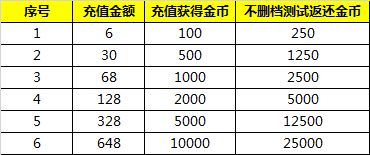 1、本次测试为删档测试,玩家测试期间充值的金币将在不删档测试时,除获得充值金额对应100%的金币,还将获得额外150%的金币返还。