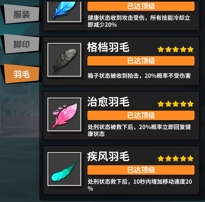 ★★★★★格挡羽毛:箱子状态被受到拍击,20%概率不受伤害。