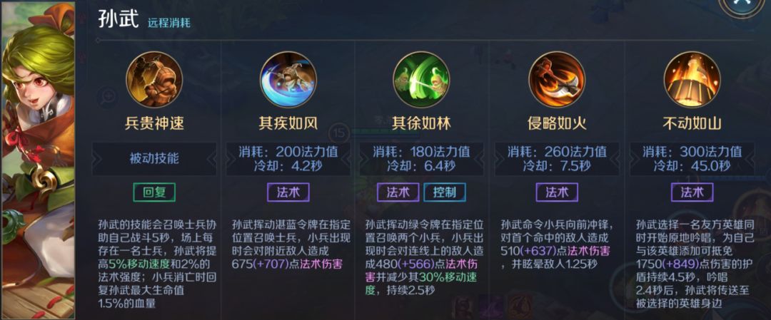 孙武的技能会召唤士兵协助自己战斗5秒,场上每存在一名士兵,孙武将提高5%移动速度和2%的法术强度;小兵消亡时回复孙武最大生命值1.5%的血量。