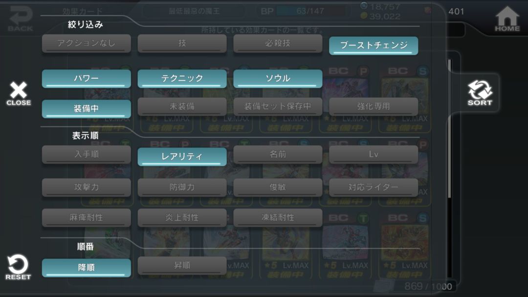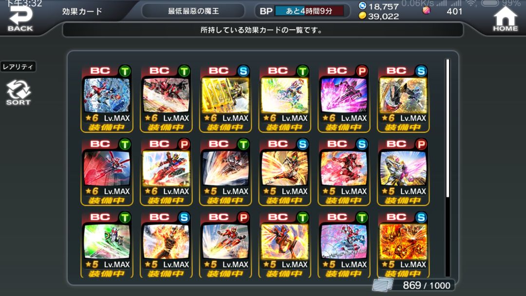 比如,在这里我选择BC卡,三属性,装备中,稀有度降序排列,就能看到我的BC按稀有度降序排列在眼前了。