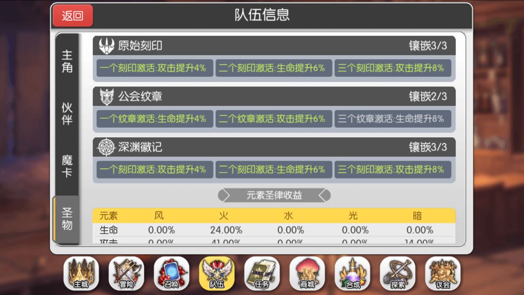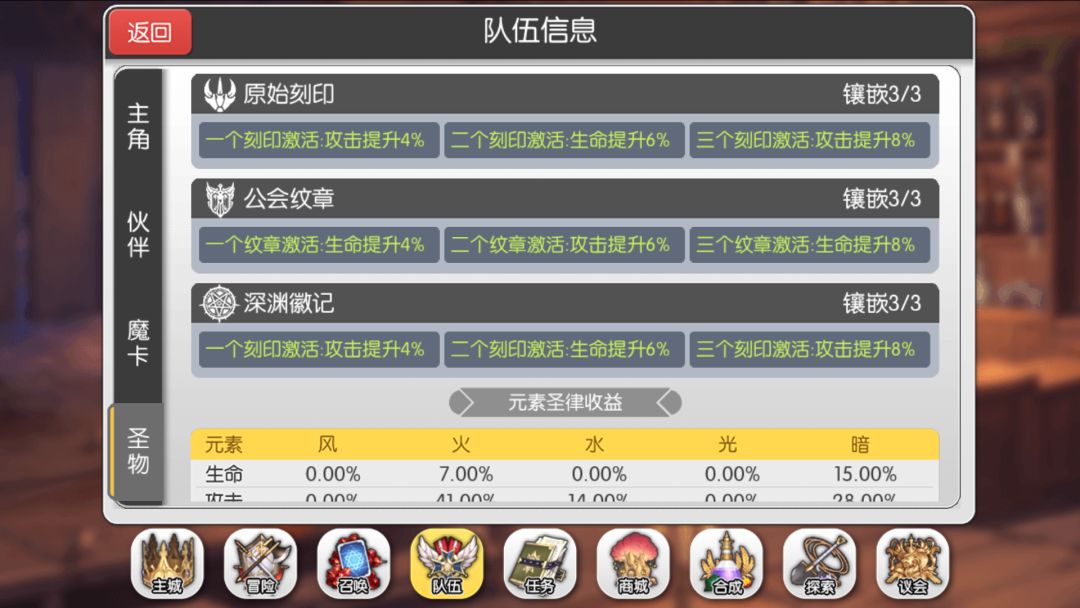 所以在选择公会纹章时,主属性队可选择本属性的两个公会纹章,再加上集卡里面获取的暗队生命增益的公会纹章,若主队为暗队,那第三个公会纹章选择风队生命增益的公会纹章即可;若主属性队只有一个该属性的公会纹章,其他两个选择暗属性和风属性生命增益的公会纹章即可。