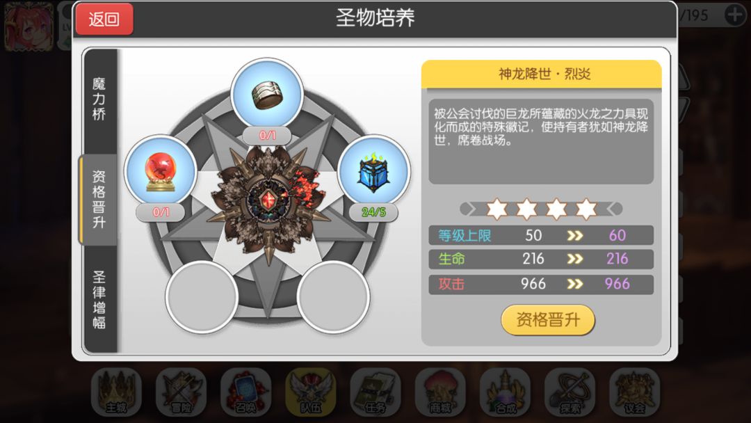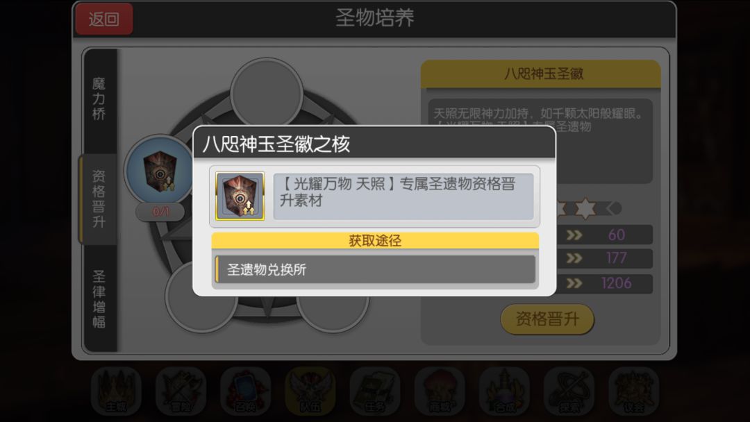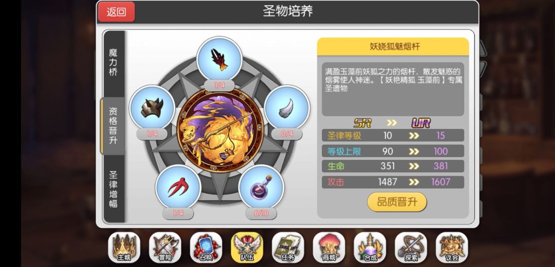 圣遗物的晋升材料是UR伙伴魂能升华后,在圣遗物界面领取对应的晋升材料,圣遗物与其他SR级圣物相比,只在晋升到UR级时需要10个邪恶核心;