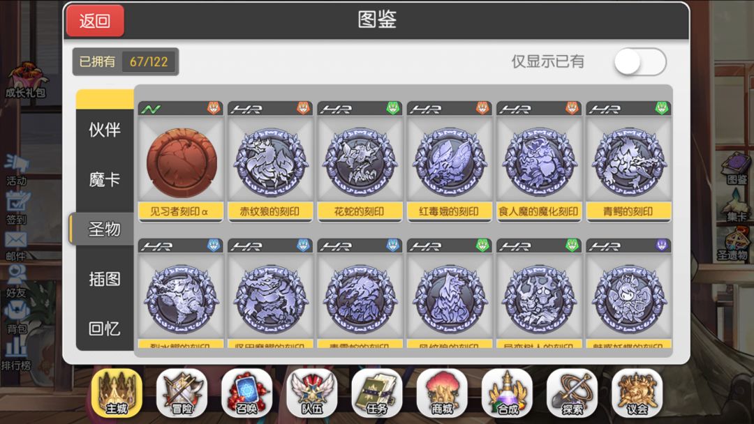 打开游戏界面右侧的图鉴,找到圣物页面,在这里查看你获得的圣物,显示的都是其达到满级时的效果。