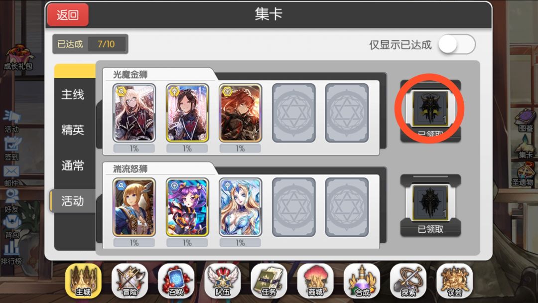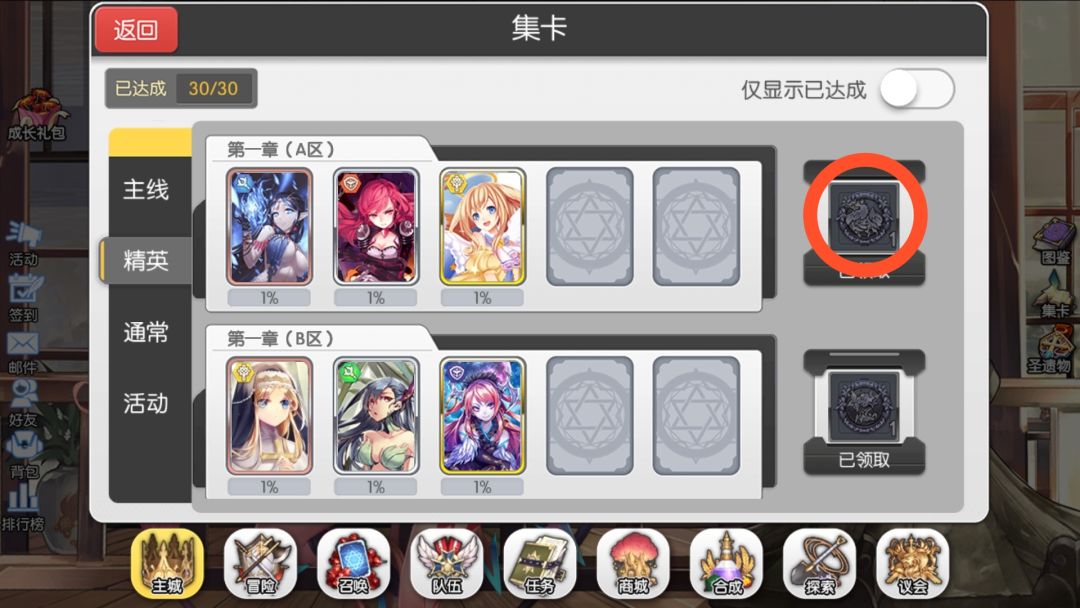 方法一:在刷出某一话四个区大师难度全部四张魔卡后,可以在集卡的精英页面领取对应的SR级圣物。