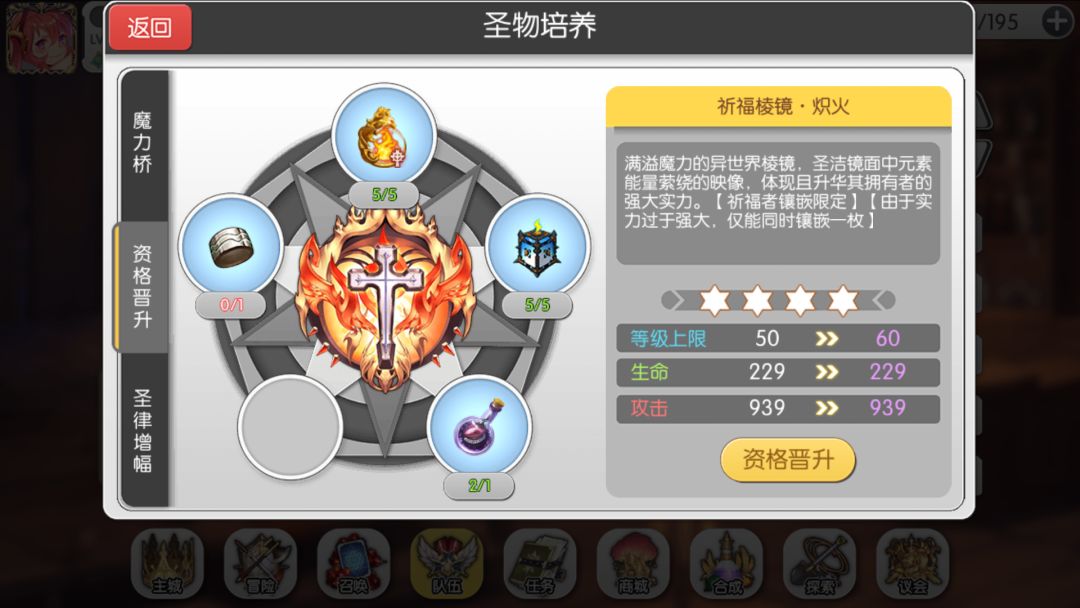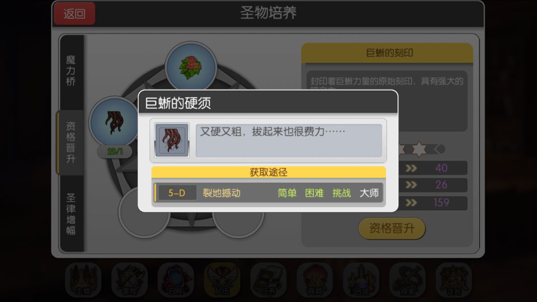 主角专属圣遗物的晋升材料则是在镜界副本的困难和挑战难度刷出对应的晋升材料,并且还需要上级魔能集合和委托任务里大师难度才能刷出的对应材料,以及邪恶核心。