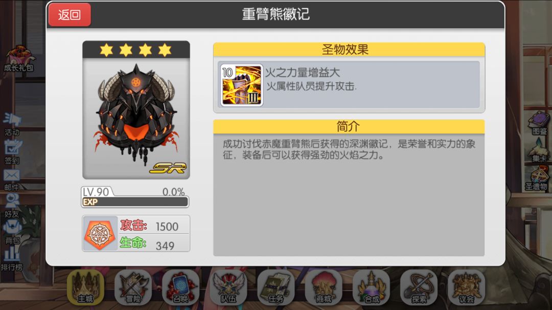 SR级圣物的等级上限为90级,深渊徽记和公会纹章提供力量增益的大多提供的最高攻击力在1500左右,不过暗魔幽鬼和光魔金狮这两个深渊徽记能提供的最高攻击力在2000以上,特别优秀。主角专属圣遗物目前只有提供力量增益的,能提供的最高攻击力为1469,只能算及格。
