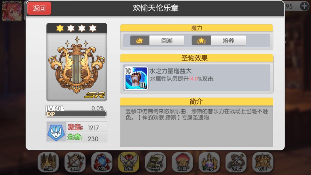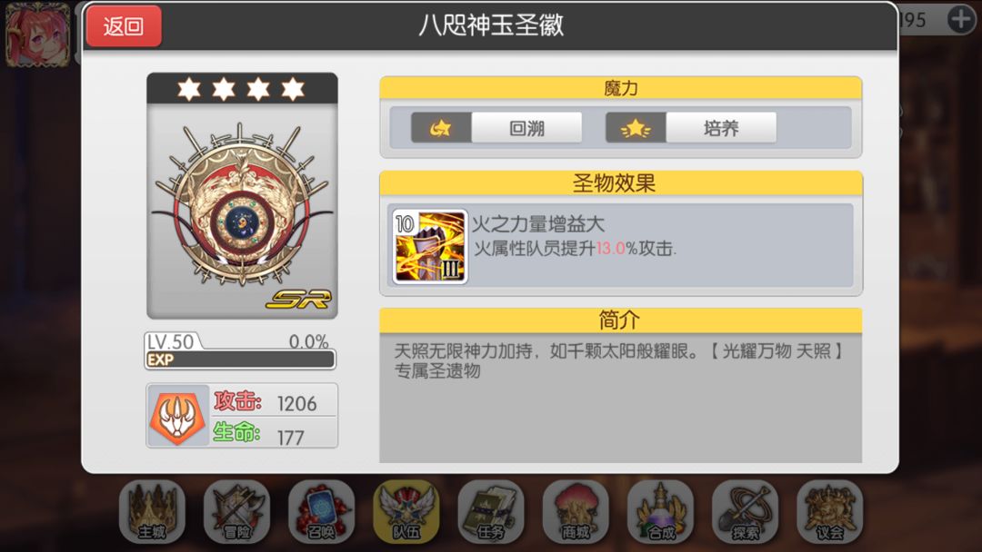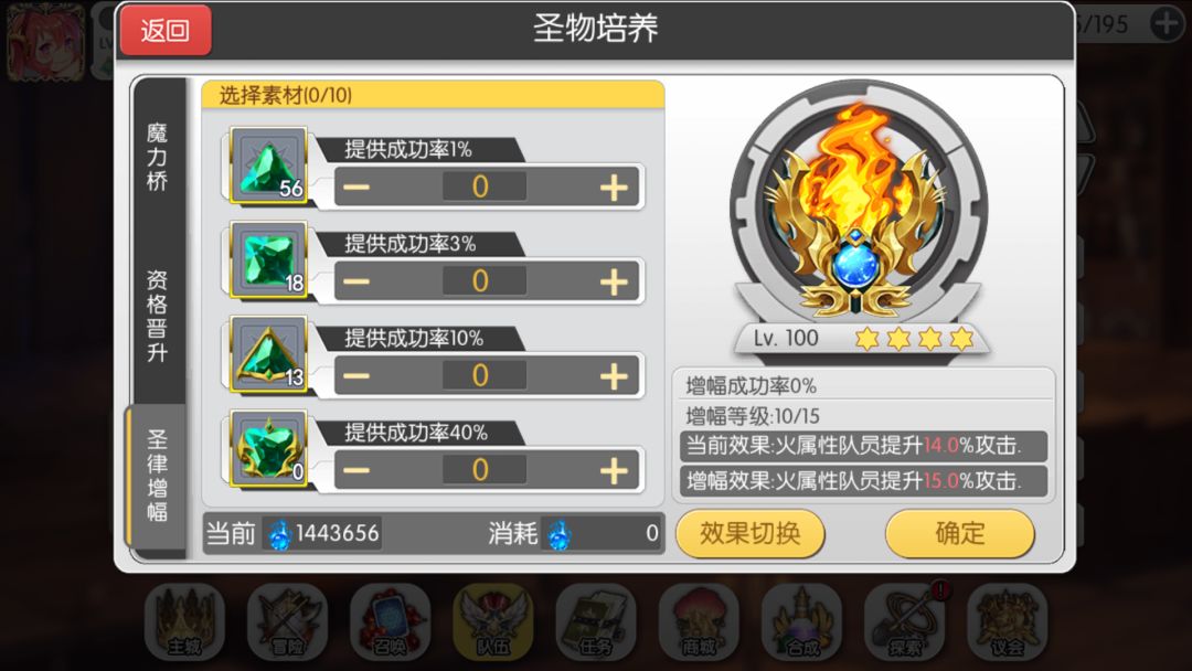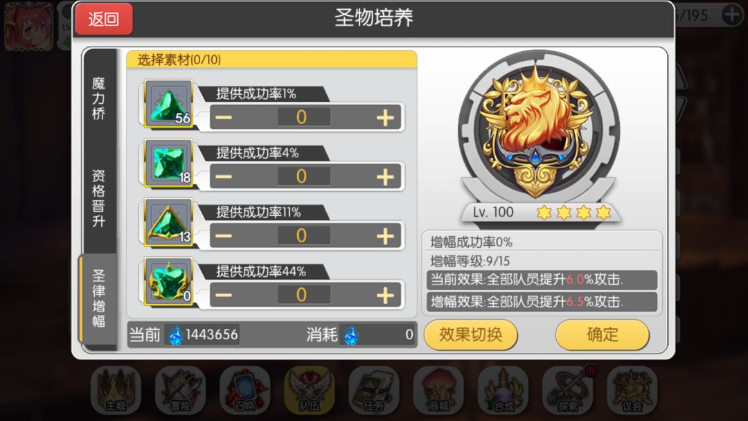 切记在将SR级圣物升到UR级前,将其原有的第一增益效果增幅到10,否则升级到UR级后同等级圣律增幅的材料数会增加。