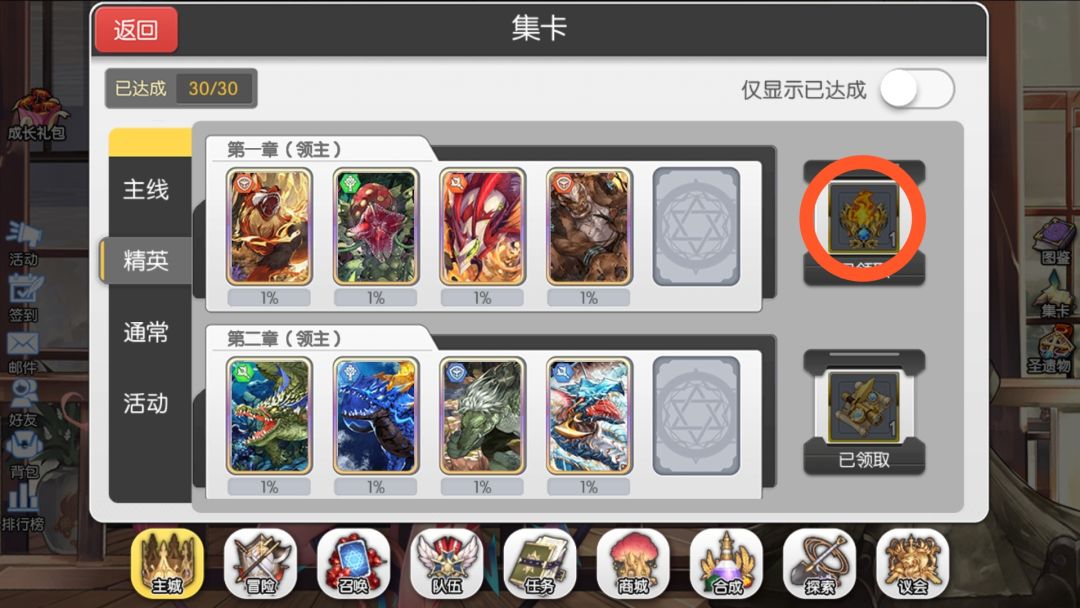 方法二:在刷出某一话某一区的简单、困难和挑战三个难度的魔卡,可以在游戏界面右侧的集卡里的精英页面领取对应的HR级圣物。