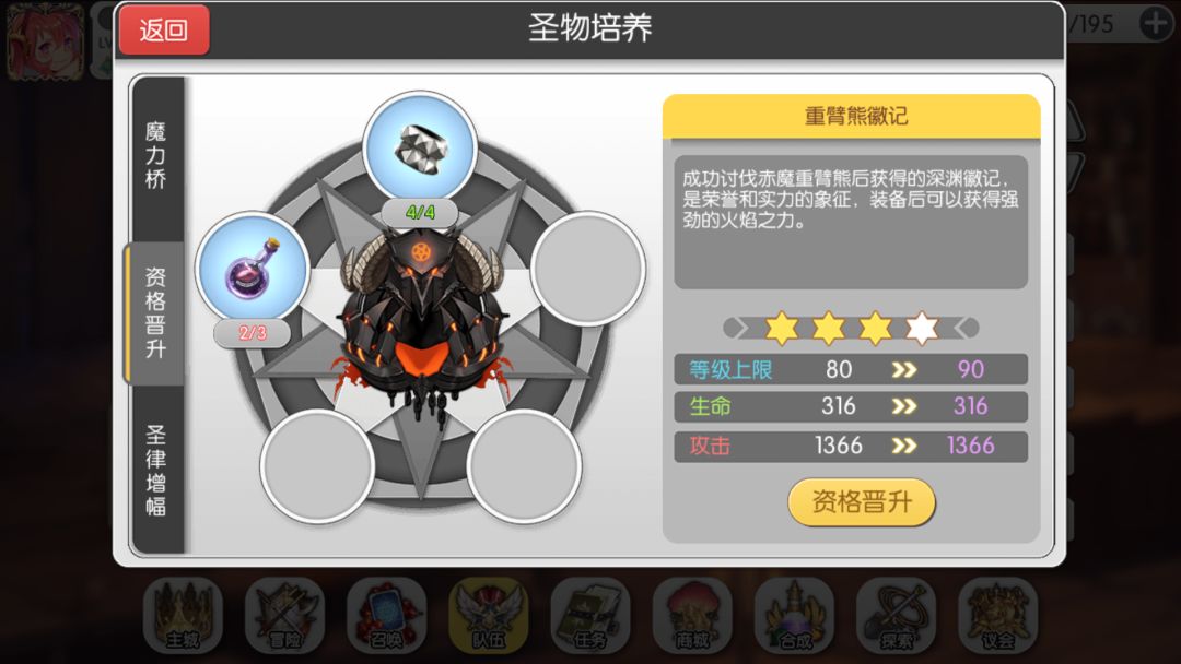 限时深渊活动获得的深渊徽记的晋升材料是在商城的讨魔页面兑换晋升的材料,只有将十个材料都兑换完,才能升到90级,并且在80级晋升到90级时还需要3个邪恶核心。