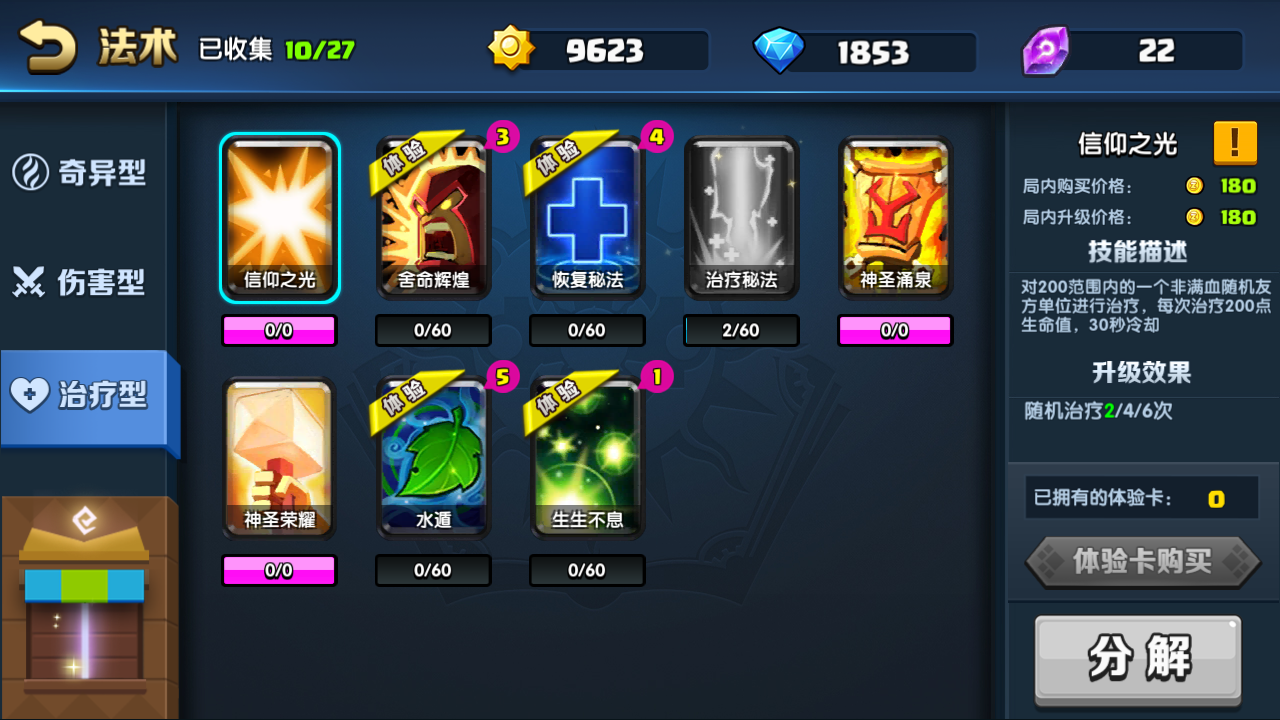 另外游荡商人会刷新涌泉和全速都是很实用的法术,刷新出来可以购买两个碎片(500金币)大概两个赛季可以攒出来 游荡商人合适购买的法术碎片:信仰之光,涌泉,全速,火焰鸟(个人喜好问题,我是觉得没用),石化 钻石碎片买一张,缓解法尘压力,金币碎片一次可以买两张(这个游戏钻石没什么软用)