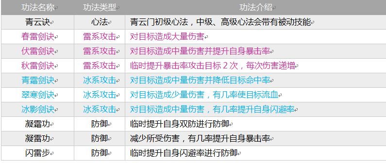 背景介绍:成立仅数万年的宗门,是六大宗门中成立时间最晚的。创派祖师青云子历时数百年便飞升至灵界,而后在与魔族的大战中大显神威,但在留下传承之后便神秘失踪。其弟子为纪念青云子而将宗门命名为青云门。青云门既有暴力输出的雷系剑诀,又有闪避反击的冰系剑诀,静如处子动如脱兔。