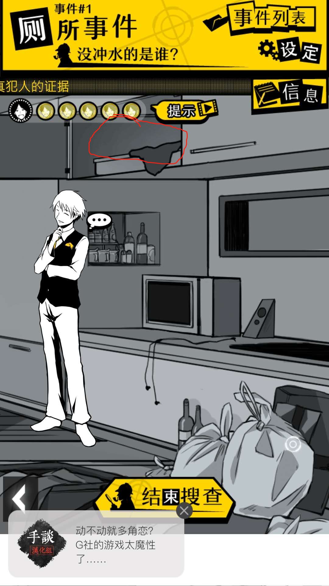 这个游戏,本身事件的解谜,除了事件五意外难度都不大,不容易game over,非要说的话,制作组藏赤木徽章的地方才是更奇奇怪怪的,所以在这里给大家标出所有徽章的位置和事件五的揭发犯人部分的流程攻略。