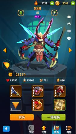 在游戏中,英雄装备分为4个部位:武器、装甲、头盔、饰品。获取装备后,可以在英雄界面为英雄穿戴,点击“一键穿装”按钮可以为自动英雄穿戴背包中属性最高的装备,非常便利。