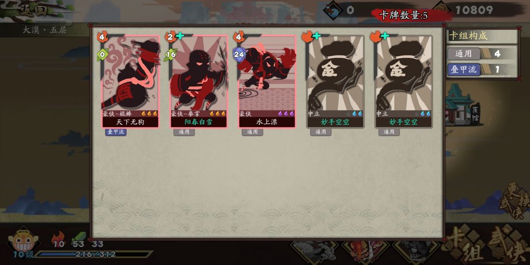 以豪侠为例,在大漠中删除多余卡,不超过手牌数,难度选择最简单