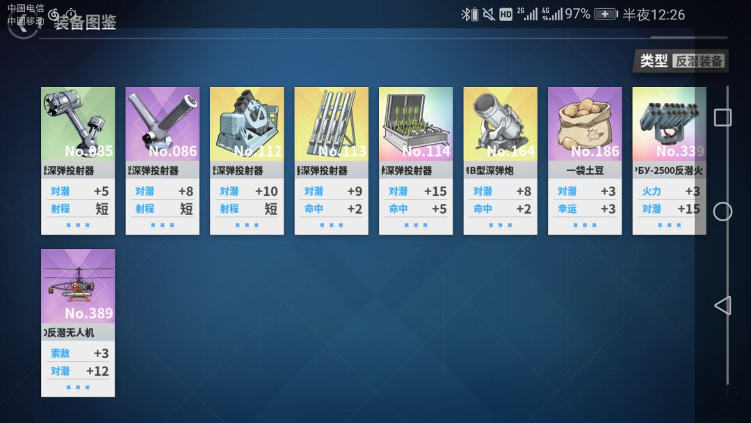 在不携带任何含反潜值装备的情况下从上到下的反潜值依次为30,74,115