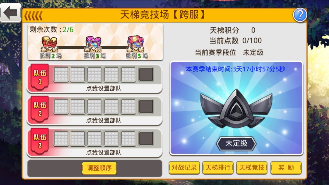 2、与乱斗竞技场一样,玩家一共需要设置3支队伍来参加天梯角逐,点击【调整顺序】可变更队伍的出战顺序。