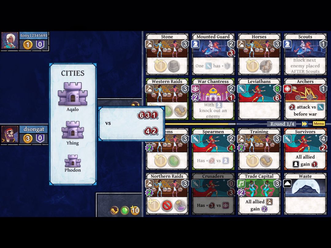 比较的方式为先比数量,后比大小。征服的城池将会给予玩家分数以及金币。