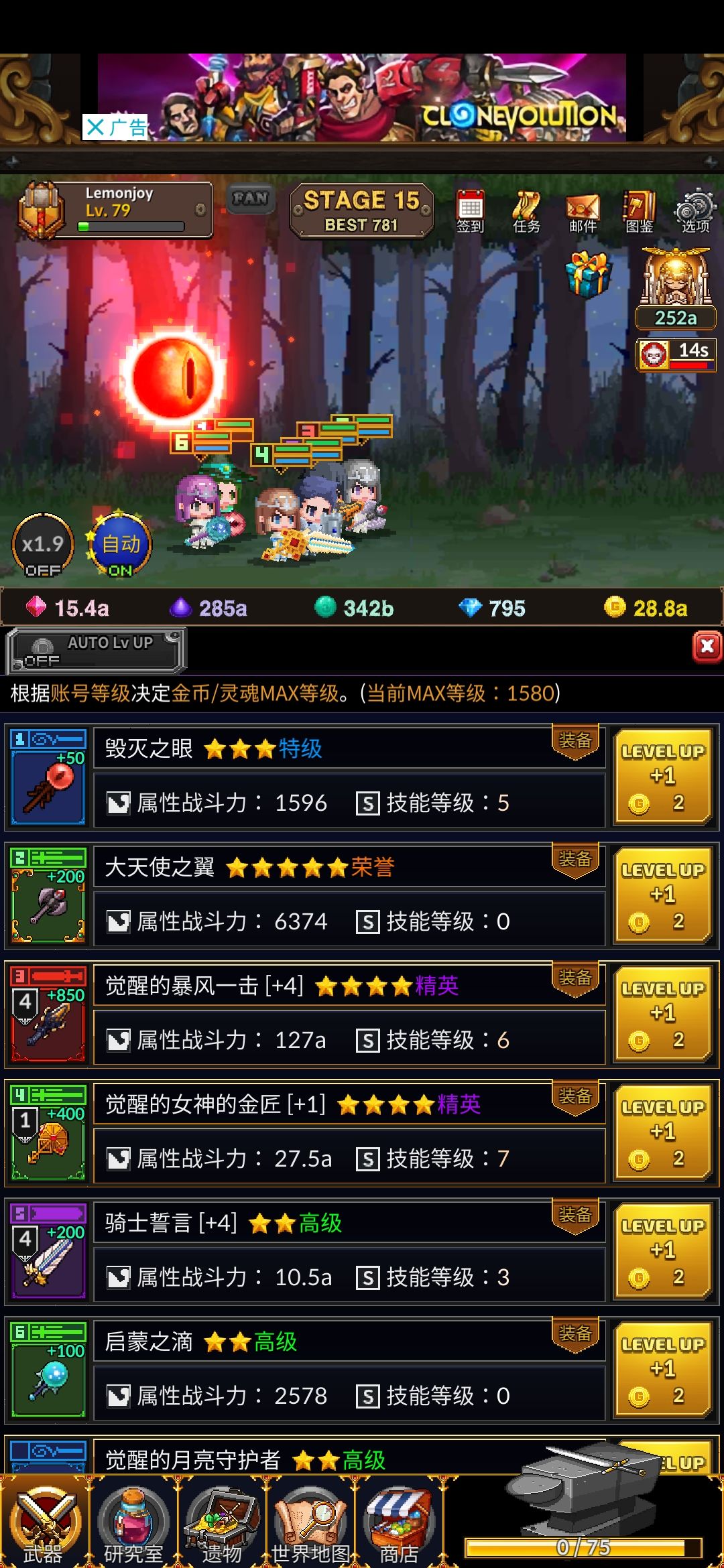 武器选择方面: 我推荐暴风一击 然后主要养成一个就好 配合暴力杖和减伤剑 一路solo 觉醒以后连续十下 不讲道理 虽然只打一个 但是推图 打矿肯定是优于aoe的