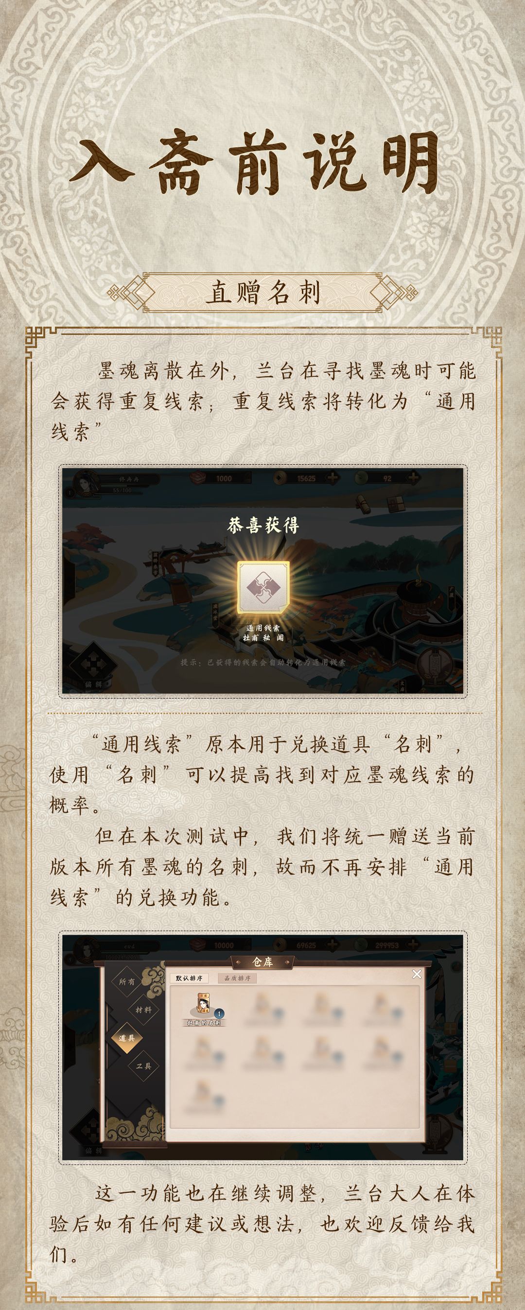 一是关于本次测试内“通用线索”兑换道具改为直接赠送的说明。