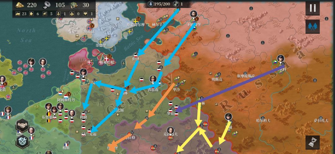 总共六条路线,每条路线代表每个部队所进攻的方向目标。(有些部队没有线路指引,是交给你自由发挥的)