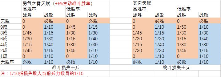 在“「杂谈」三国英雄坛战斗损失兵力与胜率关系分析“中,笔者发现,除了深不可测、一成胜率和九成胜率三种情况掉兵是固定的1/10外,在非勇气之雾天赋的情况下,还有几种情况掉兵很固定,它们分别是:八成低胜率、六成高胜率、四成低胜率和二成高胜率。这四种情况下,无论胜败,掉兵都是1/30。这说明,只要能确认当前敌人显示胜率处于这四种情况中的一个,无论是胜是败,你都能掉心中所想的兵,甚至比一成胜率更稳定!