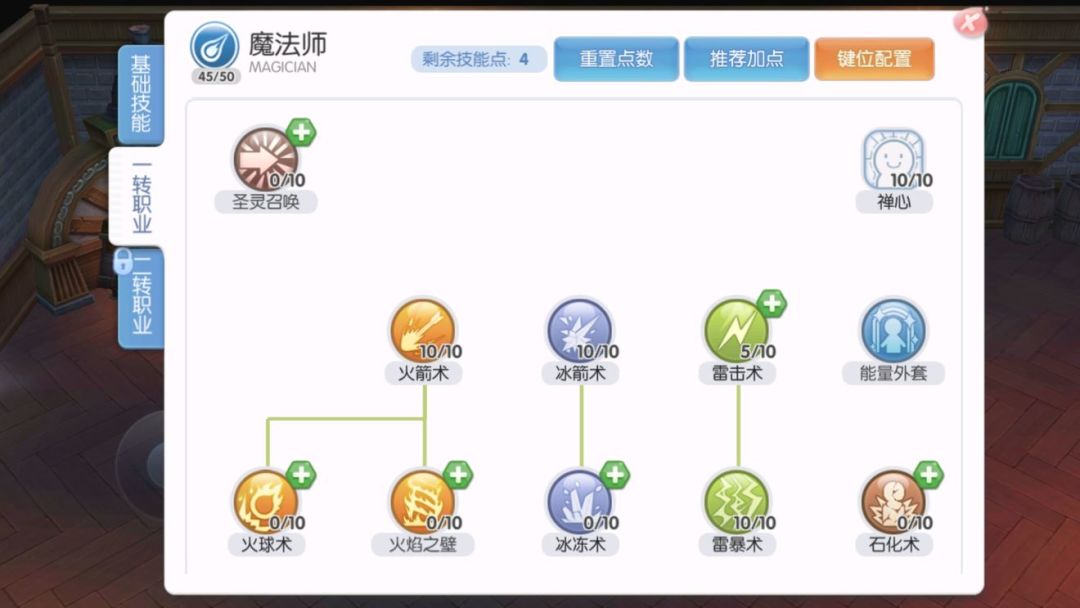冰箭火箭都加满方便挂机以及打boss。冰打火系,火打地系,具体到挂机时尽量使用低级别的吟唱时间短。风系点五是为了前置,也可以打水系使用。作为前期性价比最高的aoe雷暴补满了,不光是打群体打单体水系也可以用。吟唱很慢具体使用还是偏后期使用,前期使用尽量级别低一点,不然那个吟唱时间.. 满级禅心保证续航 减少了蓝药的使用频率。其他技能点补二转前置。