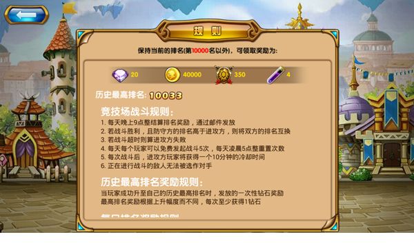 步入竞技场一个亮橙橙的叹号进入眼帘,点击后出现竞技场规则,历史奖励规则以及每日的排名奖励。