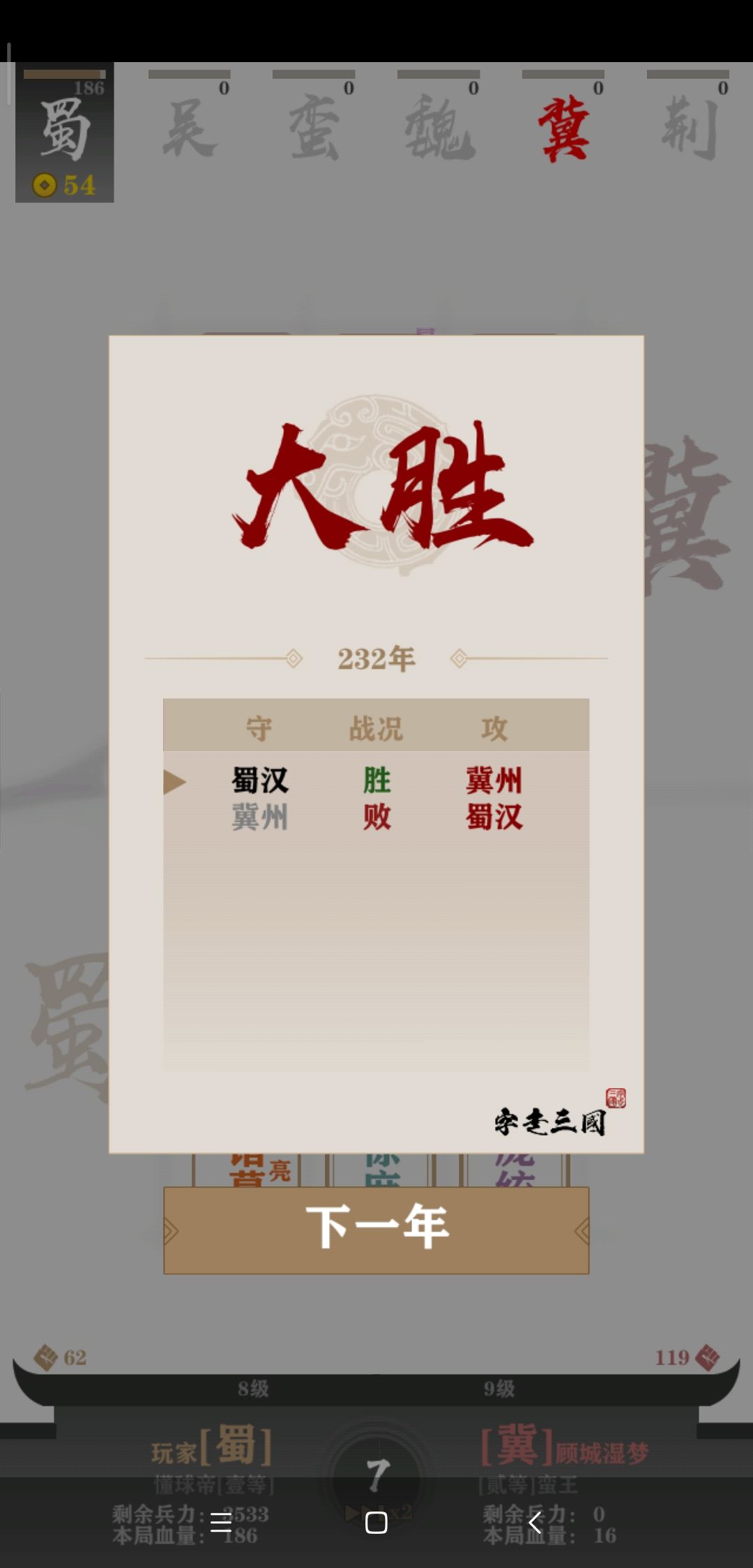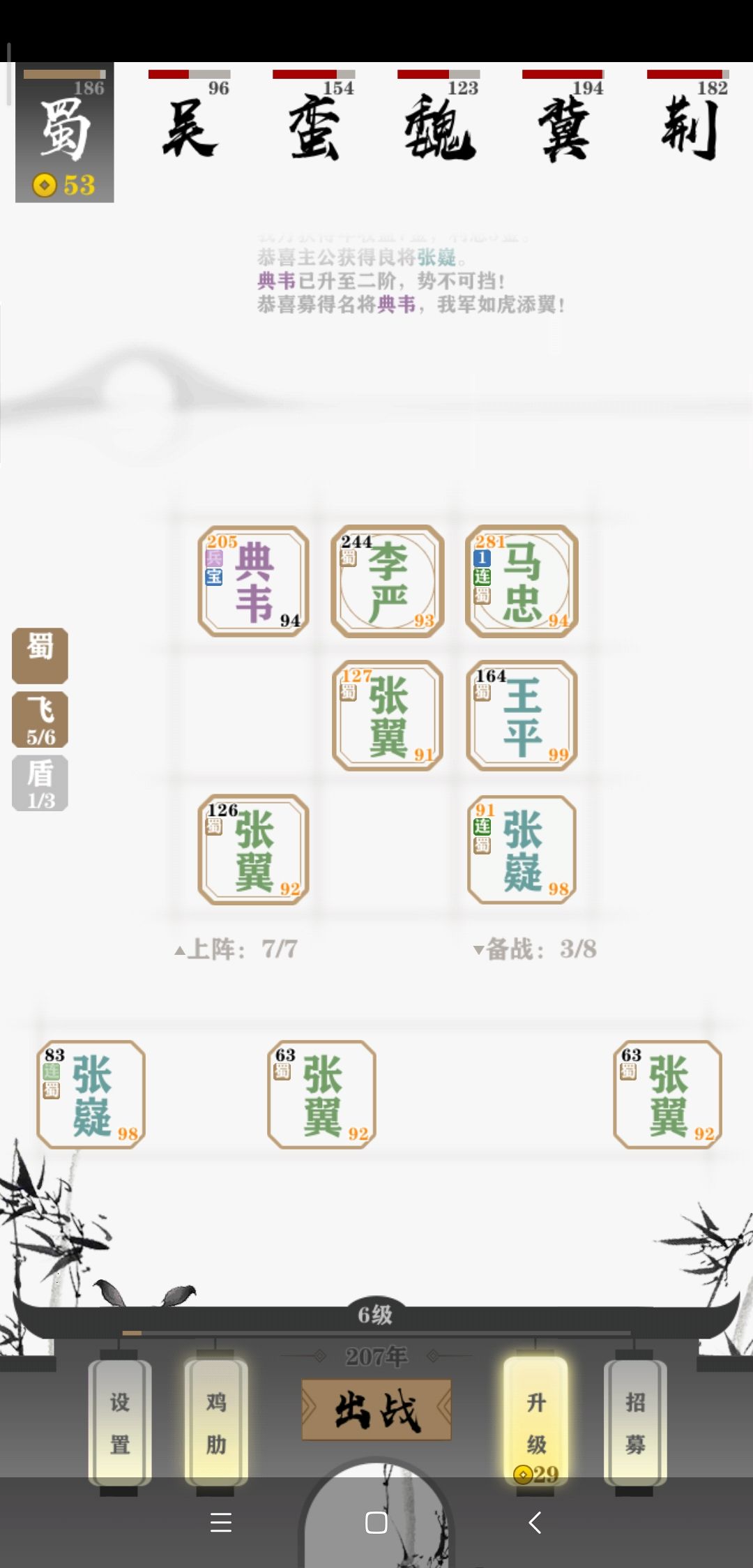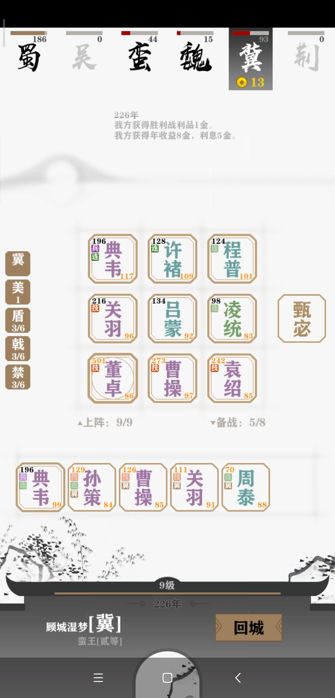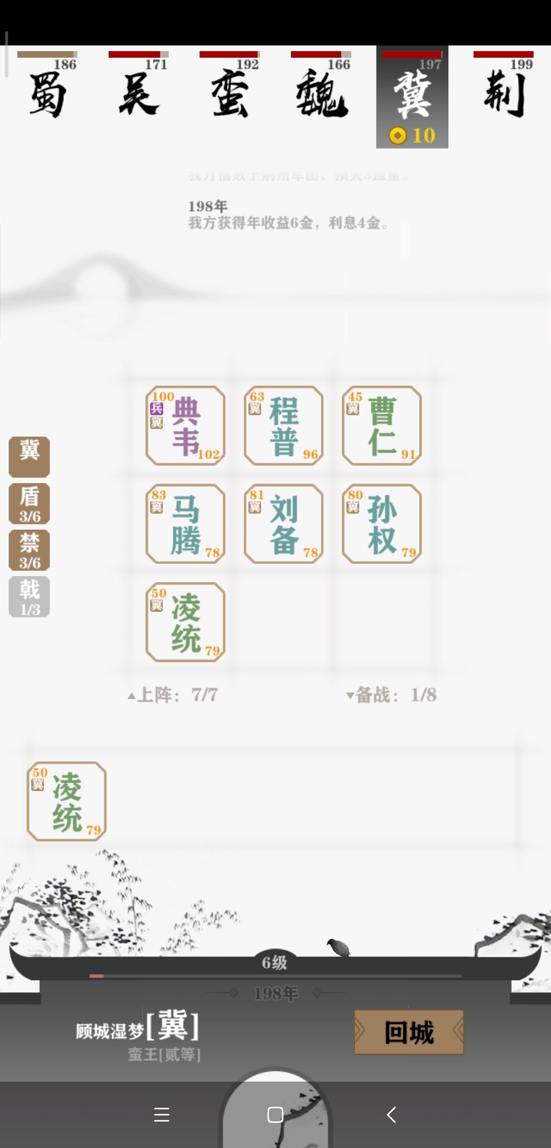 开局四五个将的时候观察一下对手们的阵容,因为AI基本都是直奔主题的,当时很容易就发现我的对手荆州和冀州在走三盾路线。(当时没截图,后来七将的时候才想起来)