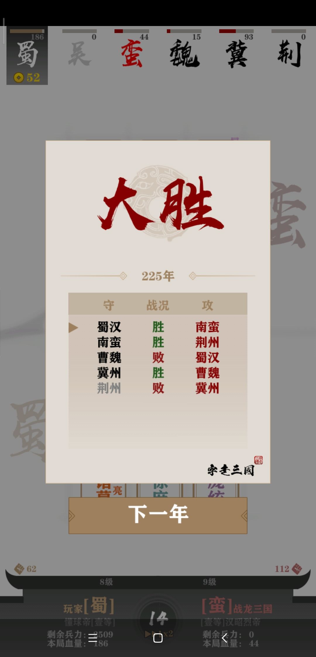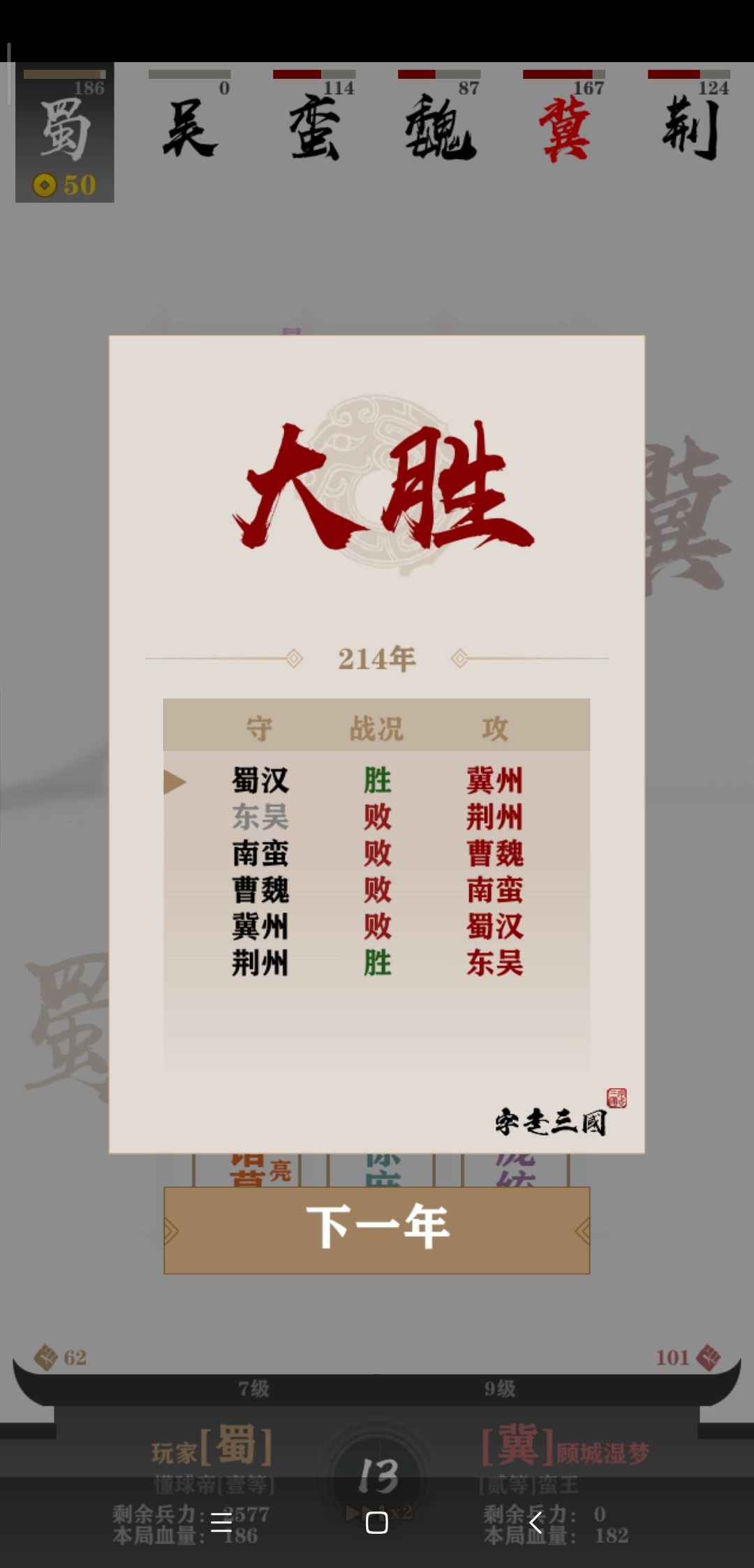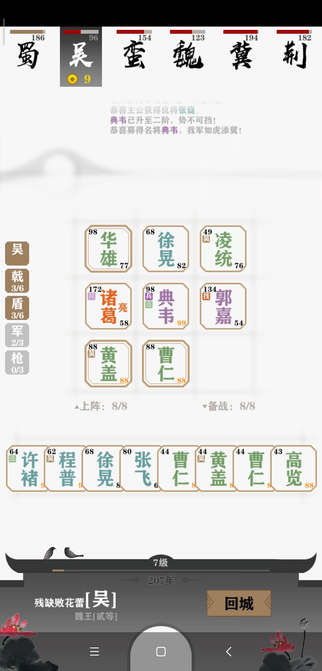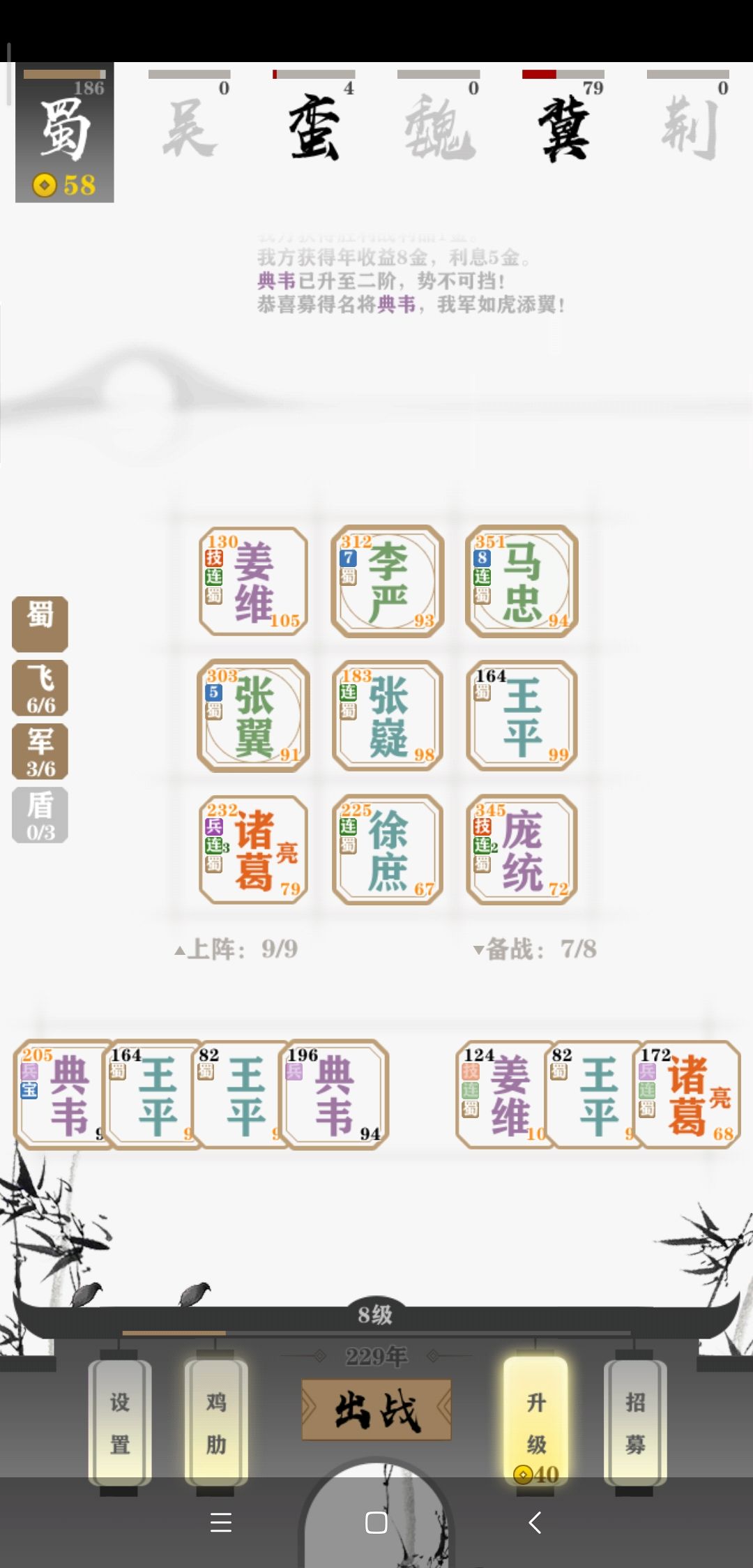 开局四五个将的时候观察一下对手们的阵容,因为AI基本都是直奔主题的,当时很容易就发现我的对手荆州和冀州在走三盾路线。(当时没截图,后来七将的时候才想起来)
